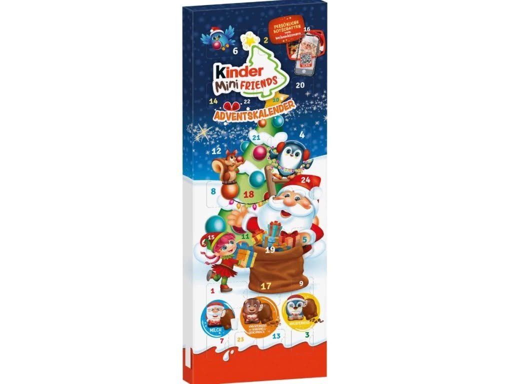Vánoční čas je časem radosti, očekávání a sladkých překvapení – a právě ty v sobě skrývá tento roztomilý adventní kalendář Kinder Mini Friends. Den po dni potěší malé i velké mlsouny 24 výjimečnými figurkami z lahodné mléčné čokolády Kinder, které se ukrývají za barevnými okénky s vánočními motivy. Každý den nový tvar, nová příchuť, nový důvod k úsměvu. V kalendáři najdete tři druhy mini čokoládových figurek: jemný Kinder Mini Friends s mléčnou náplní v podobě Santa Clause, křupavý Knusperkeks ve tvaru tučňáka a karamellovo-křupavý medvídek. Dovezeno přímo z Německa – záruka poctivé čokolády bez kompromisů.