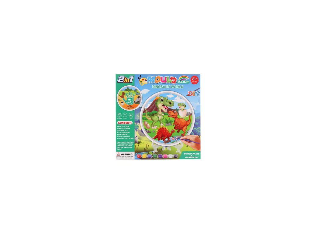 Kreativní sada obsahuje 5 sáčků se sádrou, 8 barviček, misku, 2 štětečky, kulatou formu s motivem dinosaurů a plastový stojánek. Baleno v krabici. Rozměry balení cca 22x22x6 cm. Průměr formy 20 cm. Věk 6+